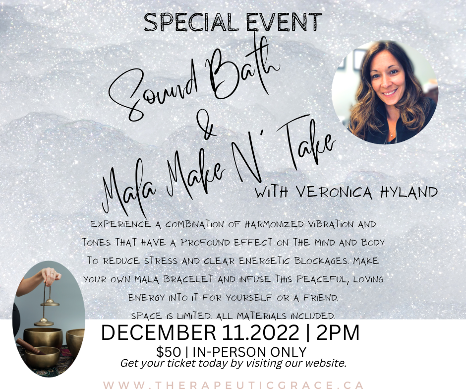 Join Veronica as she takes you on an experience through sound and vibration that is perfectly harmonized to have a profound effect on the mind and body to reduce stress and clear energetic blockages. Participants will have the opportunity to make their own personal Mala Bracelet (choice of two styles). You may make one for yourself or for a loved one. Then, through sound, infuse your bracelet with the beautiful practice of sound therapy anchoring in love and peace. This beautiful practice will leave you feeling refreshed and ready to tackle the busy holiday season with joy in your heart!