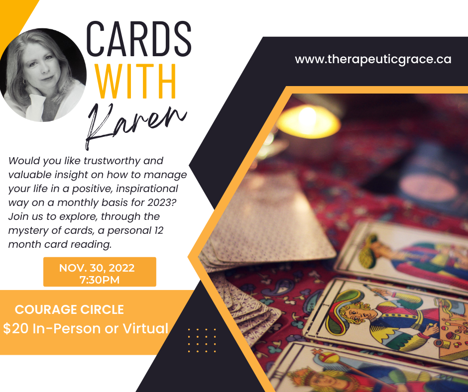Karen will lead you through a grounding, peaceful meditation before we begin and then guide you through the interpretation of symbology of the cards along with a few unique methods for interpreting the cards. Bring your journals and your choice of 1 or 2 card decks.